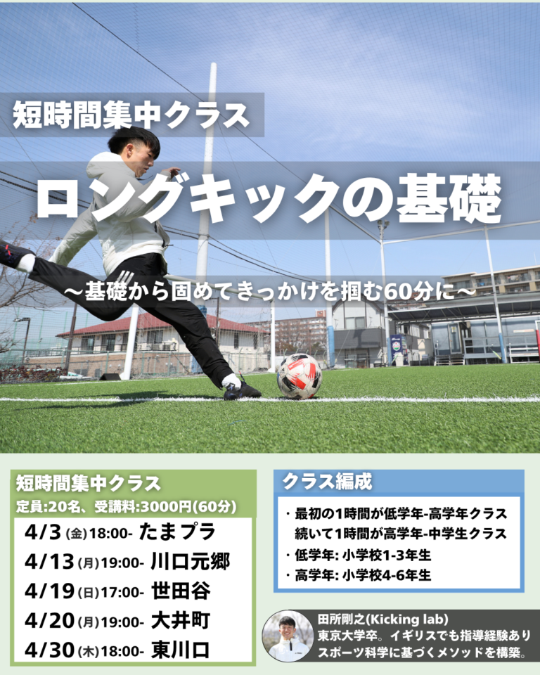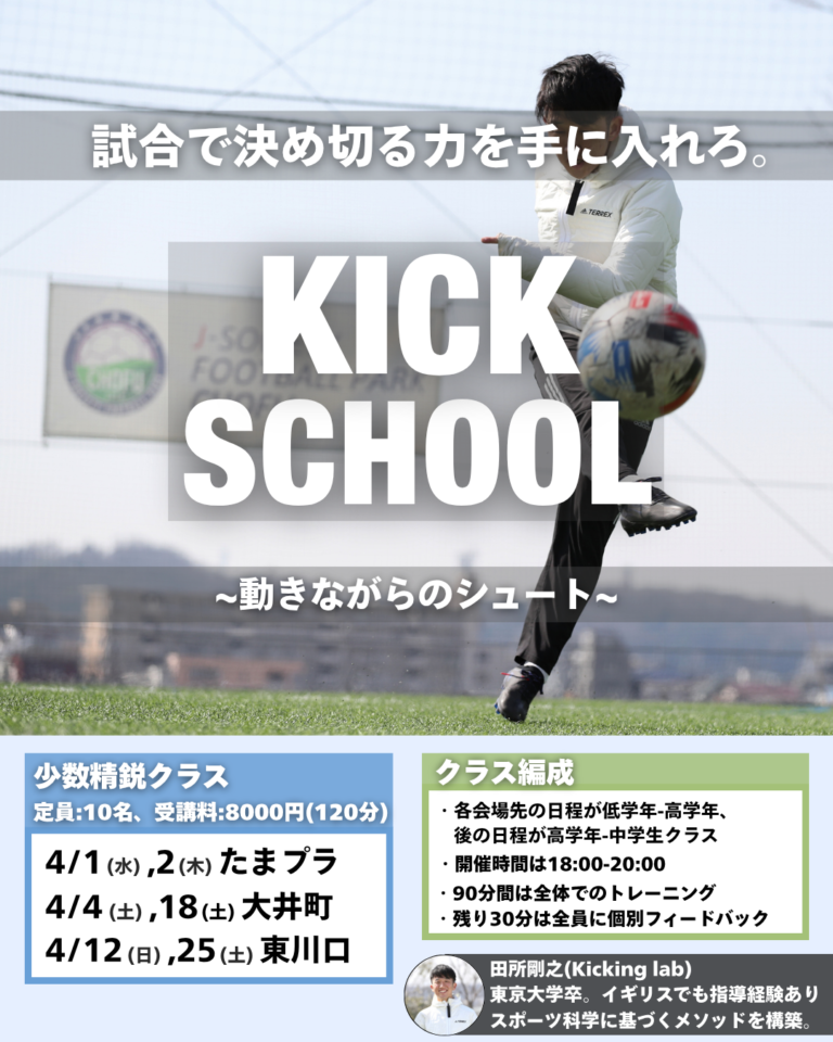 トップ選手の動作分析を基に試合で本当に使えるキックを指導。トレーニングを通して上手くなるのはもちろんのこと、正しいキックの概念を構築させることでトレーニング後の自主練の指針を作り、1人でも上手くなれる状態を目指します。