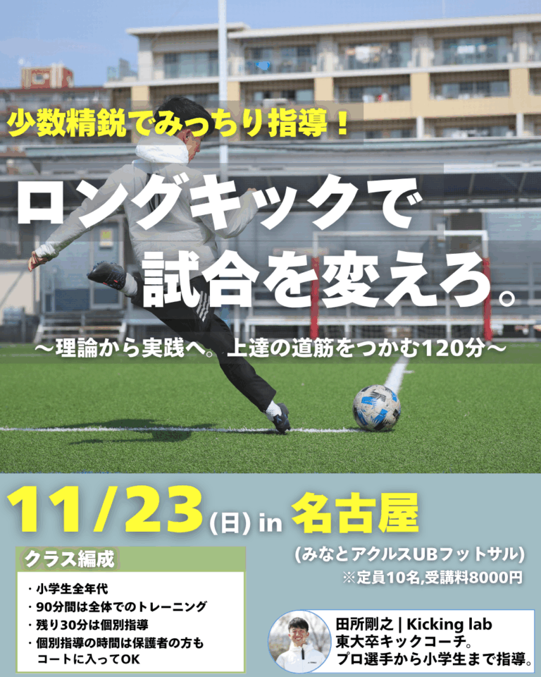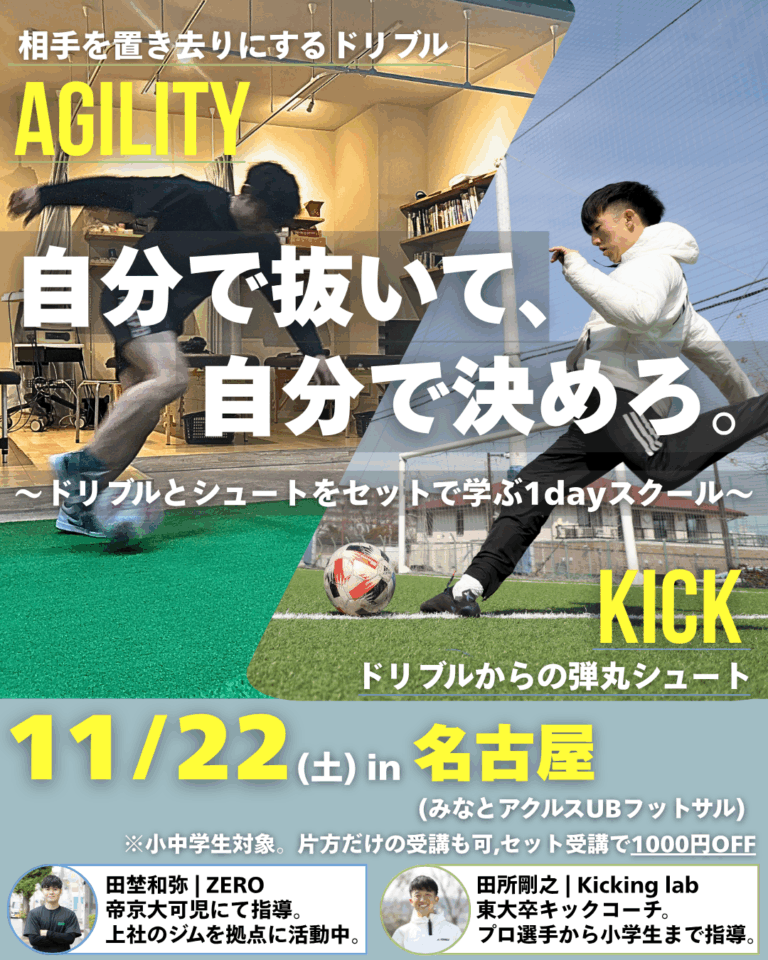 1DAYスクール 1DAYスクール 関東 1月は関東5会場にて開催します。テーマは以下の通りです。定員、時間が異なる2種類のクラスがあります。1月短時間集中クラス:逆足でのシュート少数精鋭クラス:シュートコースの打ち分け ↓↓↓日程・会場の詳細、お申し込みは該当画像をクリック↓↓↓ 地方 11月は名古屋にて開催いたします。11/22(土)はアジリティスクールとのコラボ、11/23(日)は定員を絞った2時間の少数精鋭クラスになります。 ↓↓日程・会場の詳細、お申し込みは該当画像をクリック↓↓ 公式LINEは上のボタンから友達追加できます。スクールの最新情報の配信・各種トレーニングの予約が可能で便利ですので、ぜひ追加ください。 パーソナルトレーニングはこちら ↑↑↑トレーニングのお申し込みは画像をクリック↑↑↑